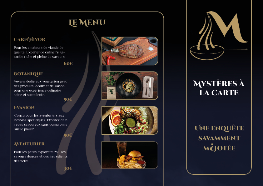 J’ai exploré plusieurs pistes graphiques pour traduire ce concept hybride, en intégrant des éléments visuels évoquant à la fois le mystère, le jeu et la gastronomie.