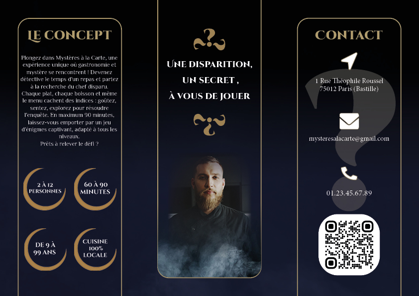 J’ai conçu un dépliant trois volets destiné à présenter le concept Mystères à la Carte à des partenaires et à des clients potentiels.